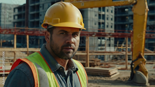 Construction Worker with Safety Helmet and Vest at Building Site - Infrastructure Development in Urban City