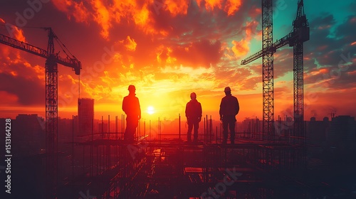 Construction Workers Against Vibrant Sunset Skyline High Resolution Picture