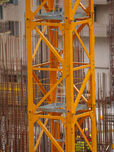 Construction Workers Among Reinforcement Bars and Heavy Equipment