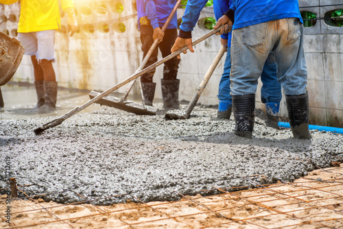 Construction workers are pouring concrete pavement at the construction site.