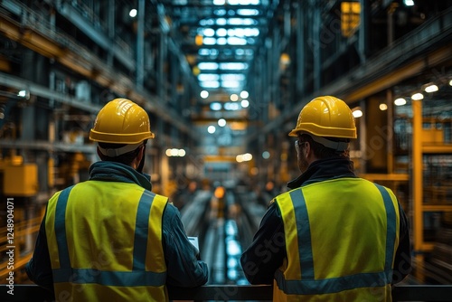 Construction Workers Discussing Plans in Bright Industrial Workshop