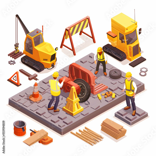 Construction Workers Engaged in Road Repair Activities and Equipment