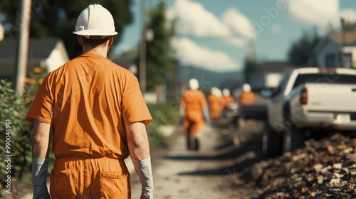 Construction Workers in Orange Uniforms and Hard Hats Walking on a Gravel Road at a Job Site