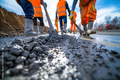 Construction workers in reflective vests and boots working on asphalt paving a road. Focus on the ground with blurred background.
