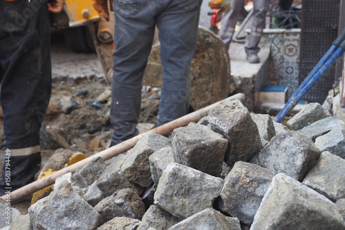 Construction workers laying stones in urban area