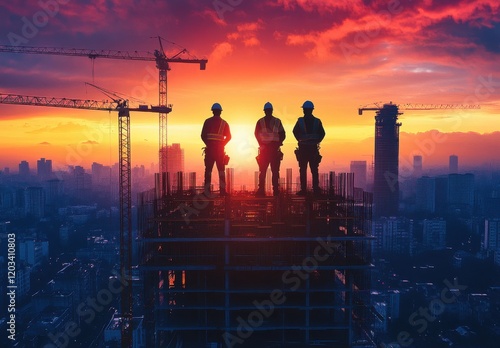Construction Workers Silhouetted Against a Dramatic Sunset Sky Over a City Skyline with Tower Cranes and Building Structures in the Background