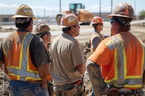 Construction workers take a break, animatedly discussing their tasks amid a bustling construction site