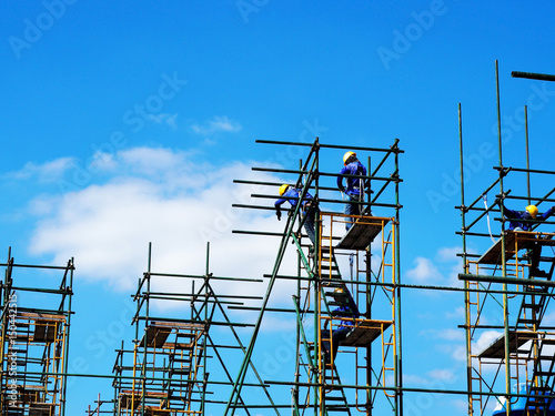 Construction workers working on scaffolding, Man Working on the Working at height with blue sky at construction site