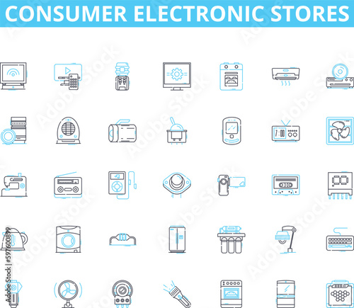 Consumer electronic stores linear icons set. Gadgets, Appliances, Smartphs, Tablets, Laptops, Cameras, Headphs line vector and concept signs. Speakers,Gaming,Wearables outline illustrations