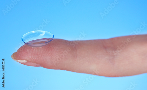 contact lens on finger on blue background
