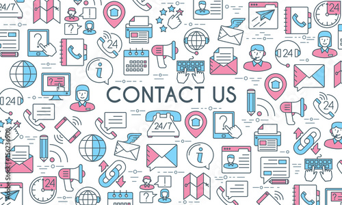 Contact us banner. Design template with flat line icons on theme customer service and support. Vector illustration