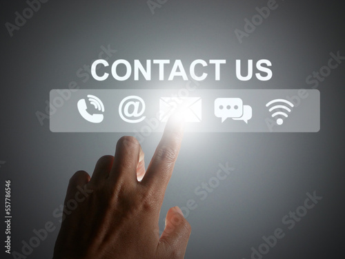Contact us or Customer support concept. Finger tapping on a virtual screen of contact icons: phone, address, email, live chat, and internet wifi