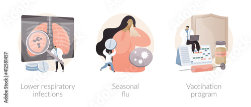 Contagious disease abstract concept vector illustration set. Lower respiratory infections, seasonal flu, vaccination program, symptoms, diagnostics and treatment, public healthcare abstract metaphor.