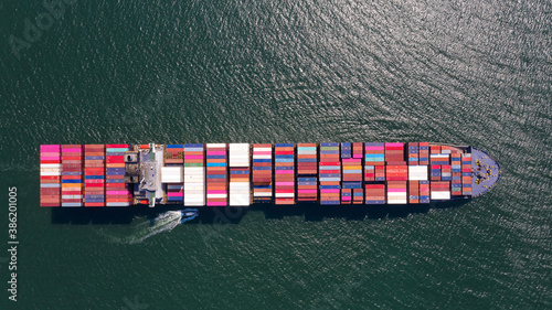 Container , container ship in export and import business and logistics. Shipping cargo to harbor by crane. Water transport International. Aerial view and top view.