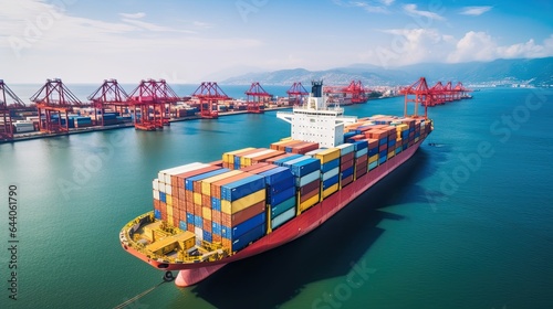 Container Cargo freight ship with working crane bridge at sunset for Logistic Import Export background