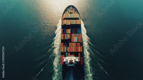Container ship at sea with digital network links, digital trade network connection concept, global shipping industry.