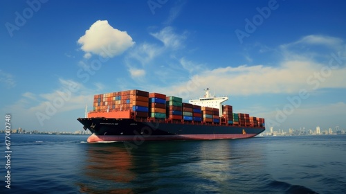 Container ship at sunset. Sea freight is one of the most important engines of the modern economy. AI generated image.