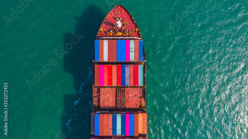 Container ship going to deep sea port, Business logistic import export shipping and transportation by container ship, Aerial view.