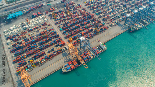Container ship in export and import business and logistics. Shipping cargo to harbor by crane. Water transport International. Aerial view and top view.