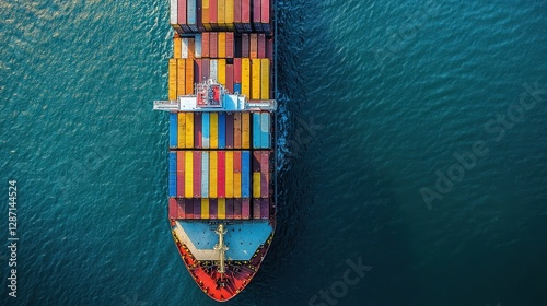 Container ship in import export and business logistic.By crane ,Trade Port , Shipping.cargo to harbor.Aerial view.Water transport.International.Shell Marine.Top view.