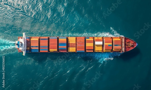 container ship in import export and business logistic.By crane ,Trade Port , Shipping.cargo to harbor.Aerial view.Water transport.International.Shell Marine.Top view