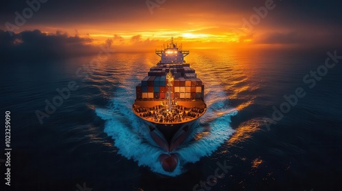 container ship navigating through a busy shipping lane at sunset with golden light casting a shimmer over the water the scene conveys the hustle of maritime trade and adventure