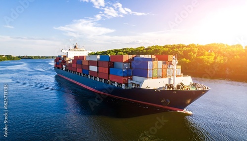Container Ship River Transport Sunset.