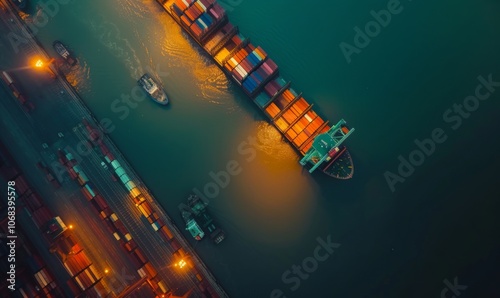 Container ships at a seaport in China. International logistics, export and import of goods, containers and commercial business