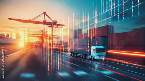 Container truck in ship port for business Logistics and transportation of Container Cargo ship and Cargo plane with working crane bridge in shipyard at sunrise, logistic import export and transport