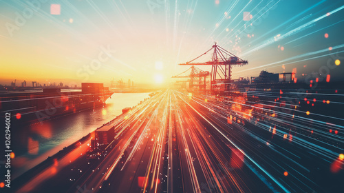 Container truck in ship port for business Logistics and transportation of Container Cargo ship and Cargo plane with working crane bridge in shipyard at sunrise, logistic import export and transport