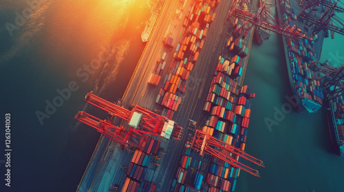 Container truck in ship port for business Logistics and transportation of Container Cargo ship and Cargo plane with working crane bridge in shipyard at sunrise, logistic import export and transport