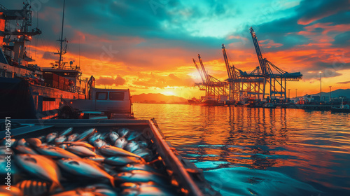 Container truck in ship port for business Logistics and transportation of Container Cargo ship and Cargo plane with working crane bridge in shipyard at sunrise, logistic import export and transport