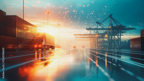 Container truck in ship port for business Logistics and transportation of Container Cargo ship and Cargo plane with working crane bridge in shipyard at sunrise, logistic import export and transport