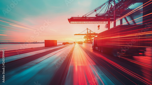 Container truck in ship port for business Logistics and transportation of Container Cargo ship and Cargo plane with working crane bridge in shipyard at sunrise, logistic import export and transport