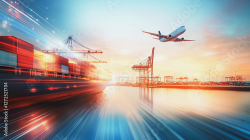 Container truck in ship port for business Logistics and transportation of Container Cargo ship and Cargo plane with working crane bridge in shipyard at sunrise, logistic import export and transport
