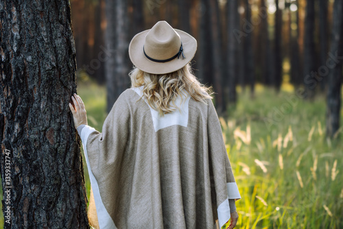 Contemplation and forest bathing. Boho woman in poncho and hat relaxing in woodland