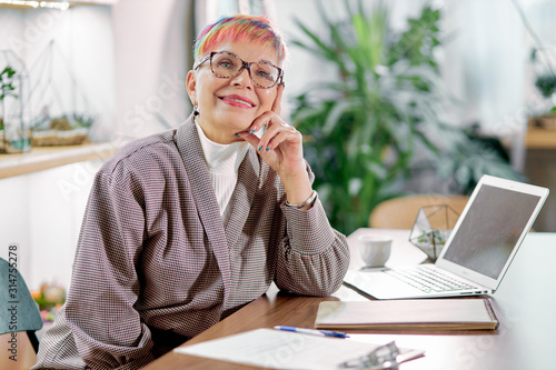 contemplative attractive senior woman wearing blazer, glasses, colorful strands of hair sit looking side and think.
