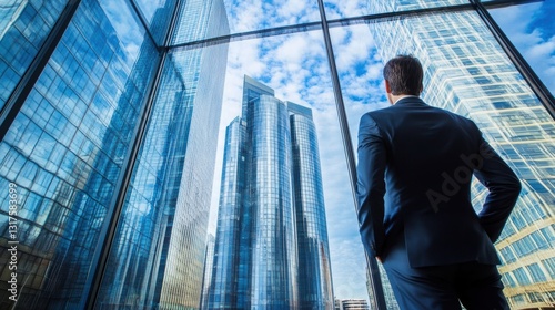 Contemplative businessman standing near big window looking out at city, thoughtful entrepreneur building future plans, thinking over ways to overcome business problems, pass through crisis, back view