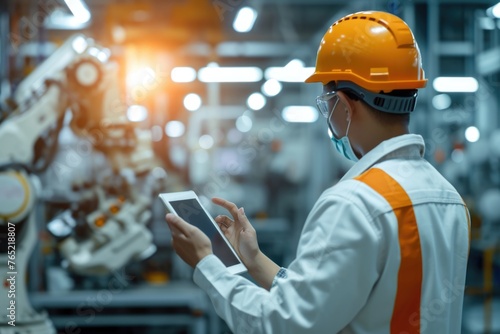Contemplative engineer holding tablet pc in robot factory