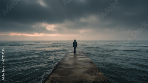 Contemplative Figure at Ocean's Edge: A solitary person on a pier, gazing out at the stormy sea under a cloudy sky.