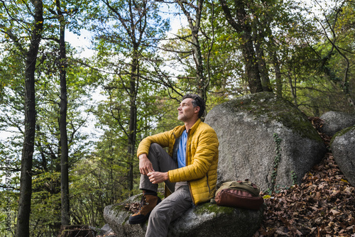 Contemplative man with backpack sitting on rock in forest