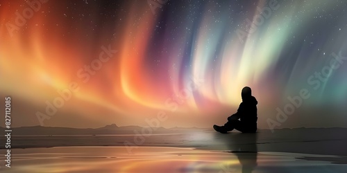 Contemplative silhouette illuminated by vibrant Northern Lights in icy landscape. Concept Northern Lights, Silhouette, Landscape, Contemplative Mood, Vibrant Colors
