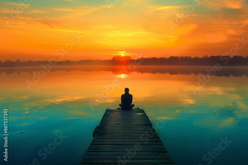 Contemplative Sunset: Silhouette of Person Sitting on Dock, Overlooking Calm Lake and Reflective Sky