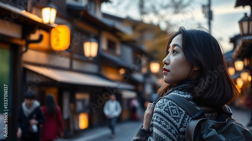 Contemplative Young Woman Strolling Through Historic Japanese Street at Dusk
