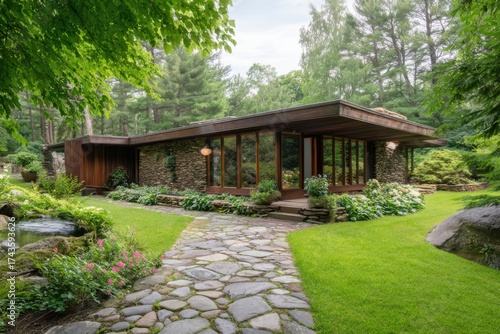 Contemporary architectural design harmonizes beautifully with the natural surroundings in a vibrant garden, set against a backdrop of a cloudy sky