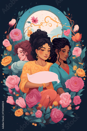 Contemporary art modern Female faces portraits, flowers and leaves. Concept of hand drawn beauty woman. 8 March. International Happy Women's Day.