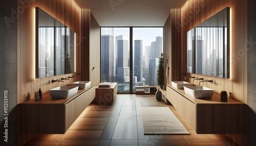 Contemporary bathroom with wood paneling, dual sinks, and mirrors. Minimalist style. City view from large windows. 3D Rendering
