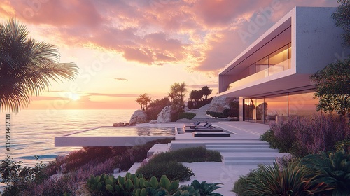 Contemporary beachfront estate with sharp angles, manicured gardens, and ocean waves lapping nearby, soft sunset glow