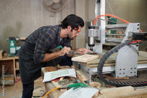 Contemporary Carpenter Working, Portrait of modern carpenter making wood furniture while working in joinery lit by sunlight with factory background on small business concept, copy space