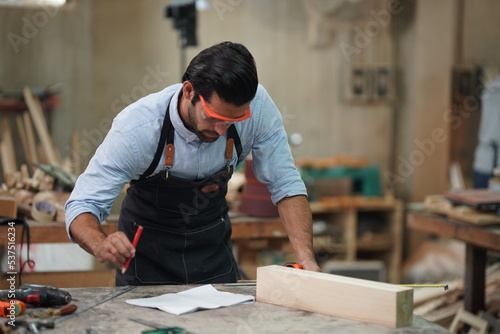 Contemporary Carpenter Working, Portrait of modern carpenter making wood furniture while working in joinery lit by sunlight with factory background on small business concept, copy space